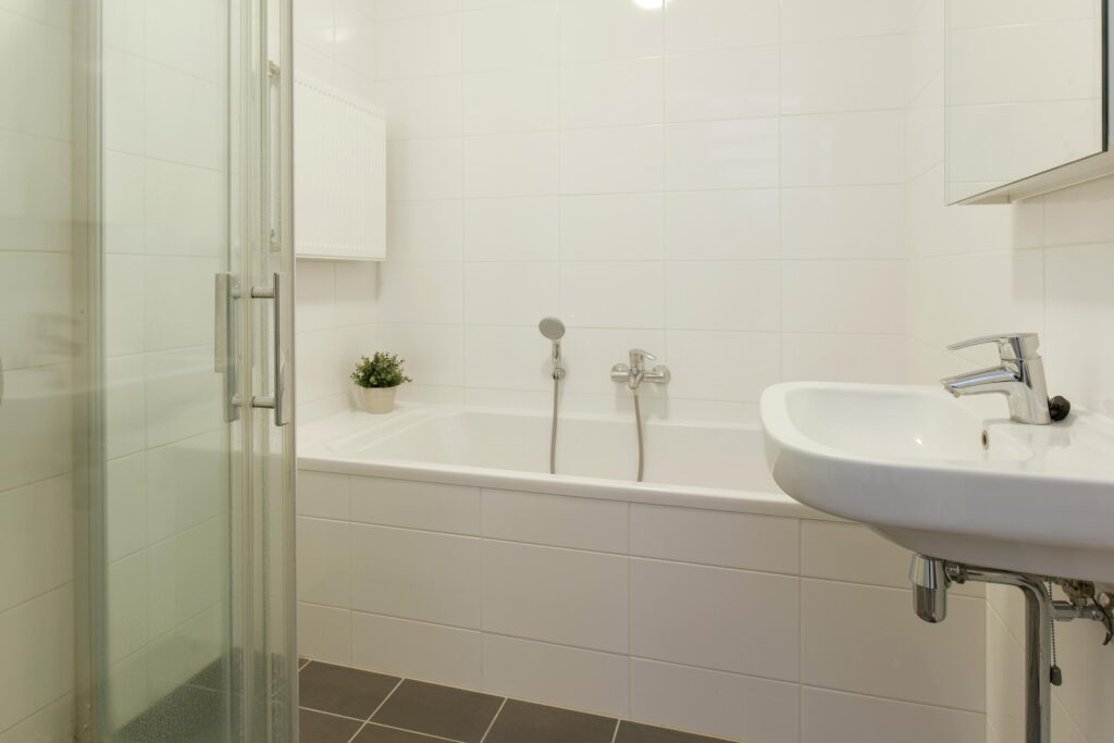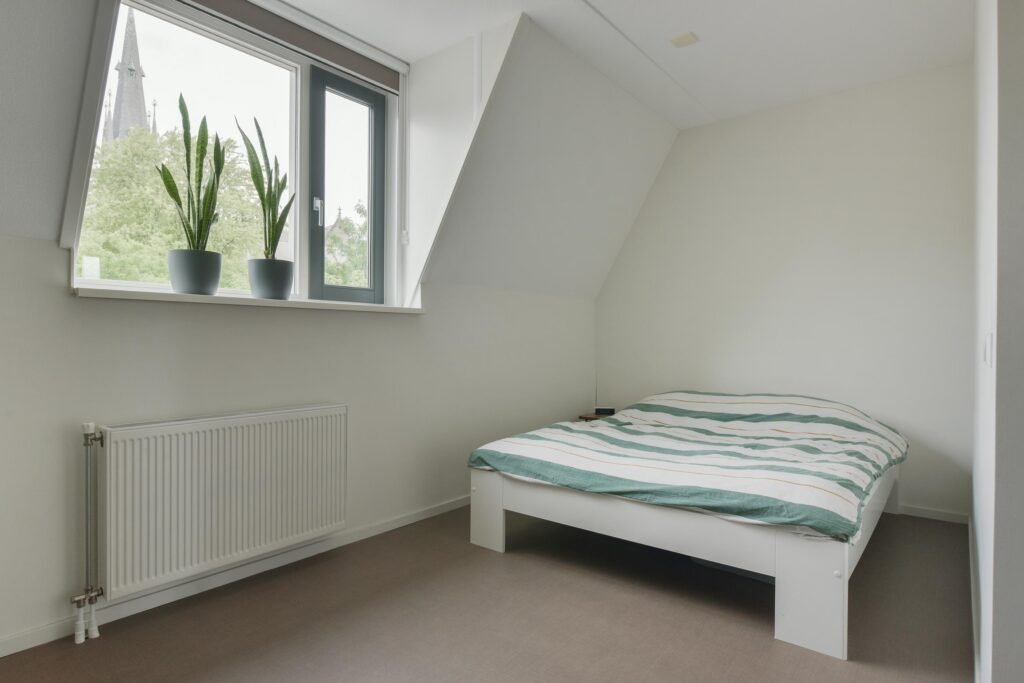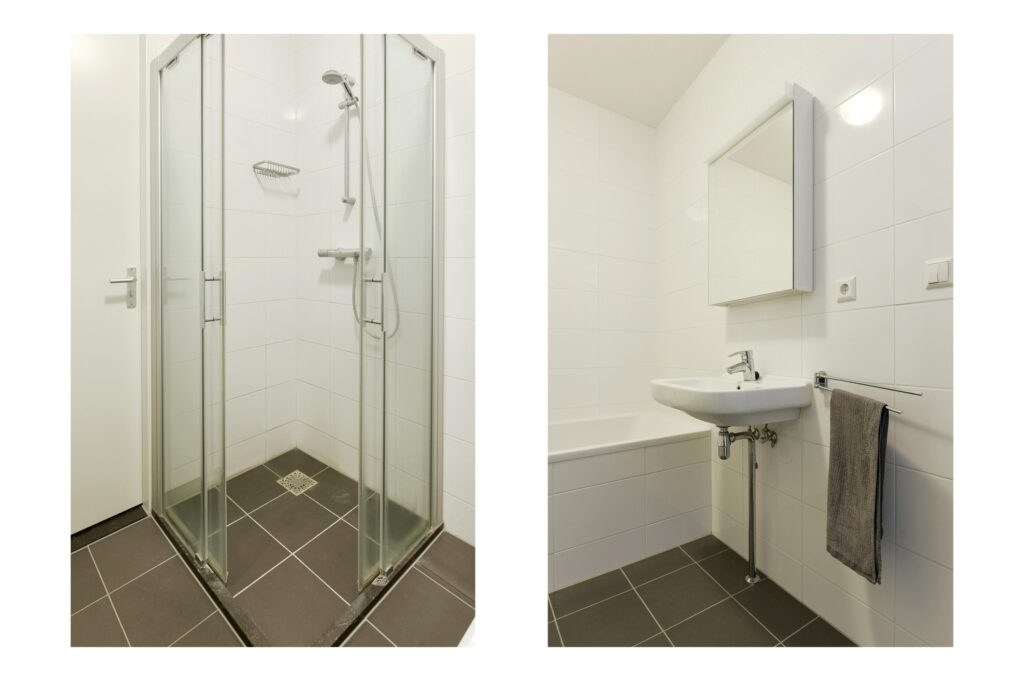 Ruime slaapkamer aan de voorzijde, badkamer met wastafel, inloopdouche en ligbad, afzonderlijk toilet en een tweede slaapkamer aan de achterzijde.