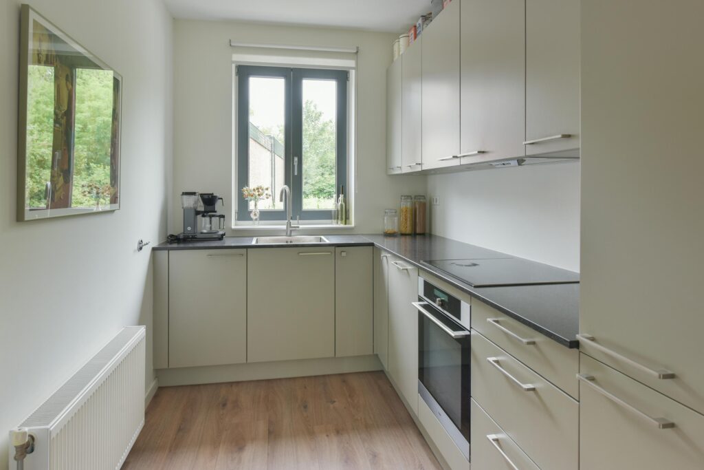 De moderne keuken beschikt over een inductiekookplaat, afzuigkap, vaatwasser, oven en een koel-/vriescombinatie.
