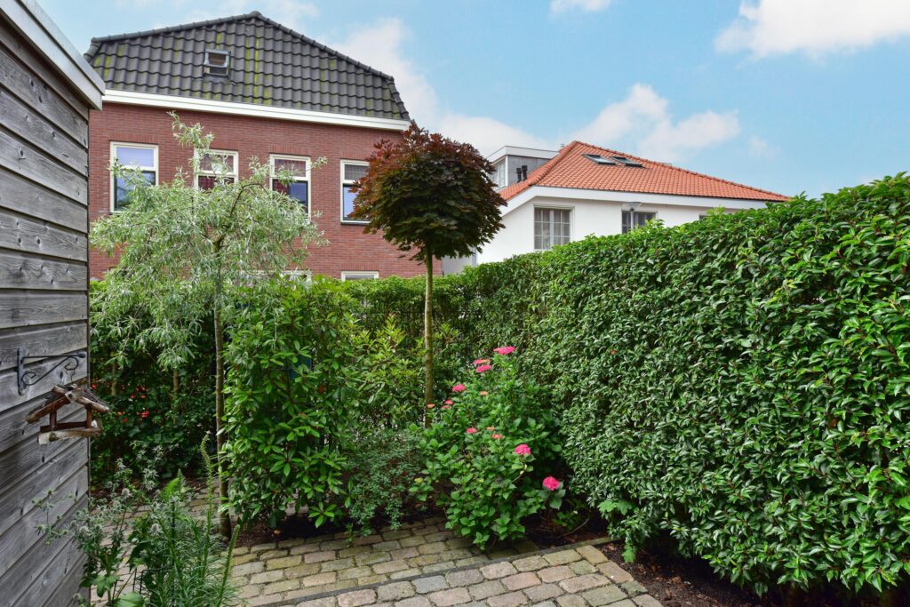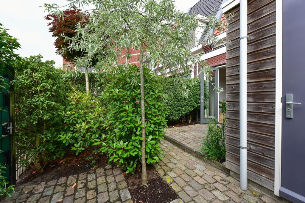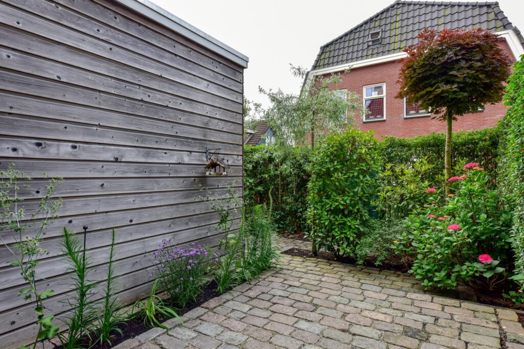 Mooie verzorgde achtertuin gelegen op het zuiden met schuur en een achterom.
