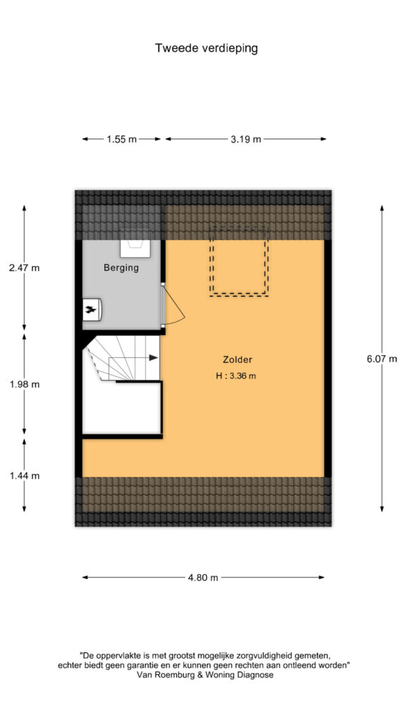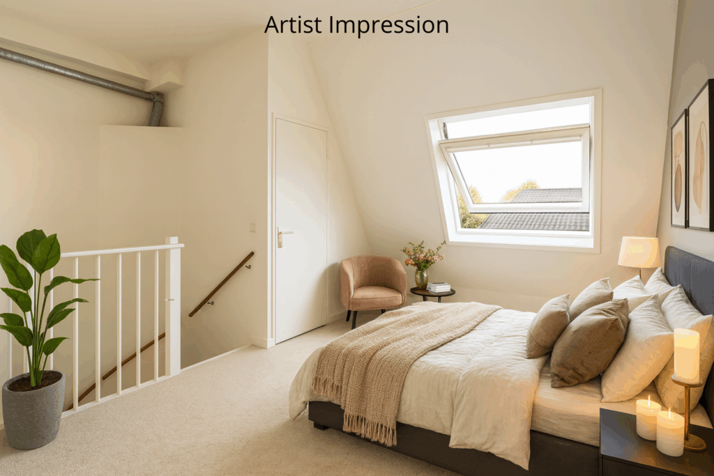 Deze verdieping, met groot dakraam aan de achterzijde, is thans in gebruik als één grote slaapkamer maar biedt tal van mogelijkheden mede door het grote dakraam en de hoogte. Denk bijvoorbeeld aan een opbergkast op maat waarmee elke (schuine) hoek optimaal benut kan worden in combinatie met een werk-/hobbykamer.