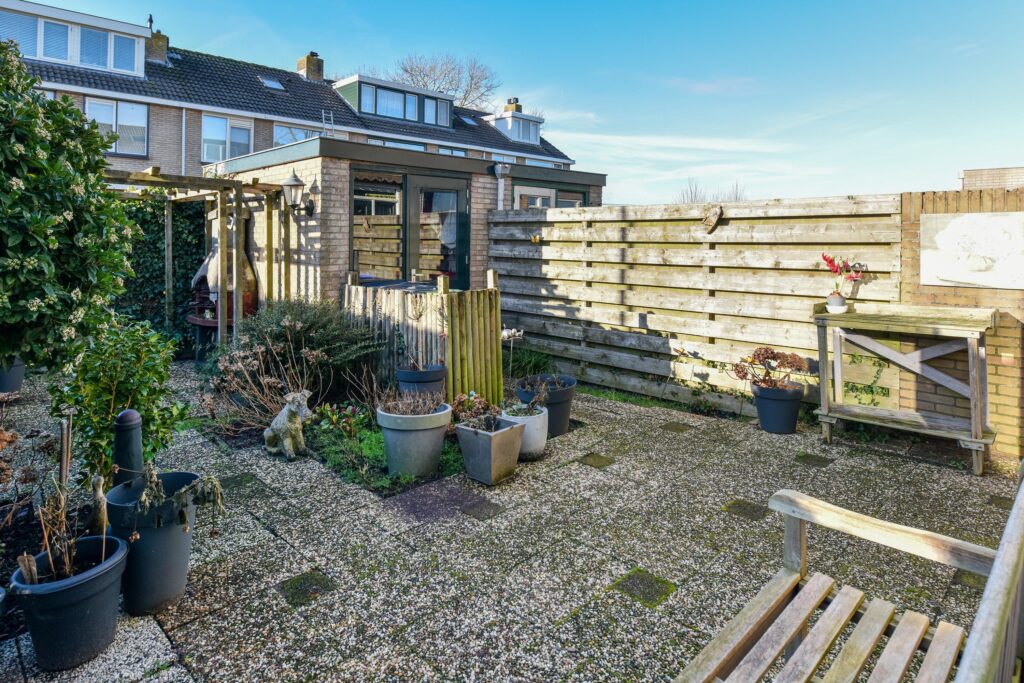 De aangename achtertuin is gelegen op het westen, heeft een vrijstaande stenen schuur en een achterom.