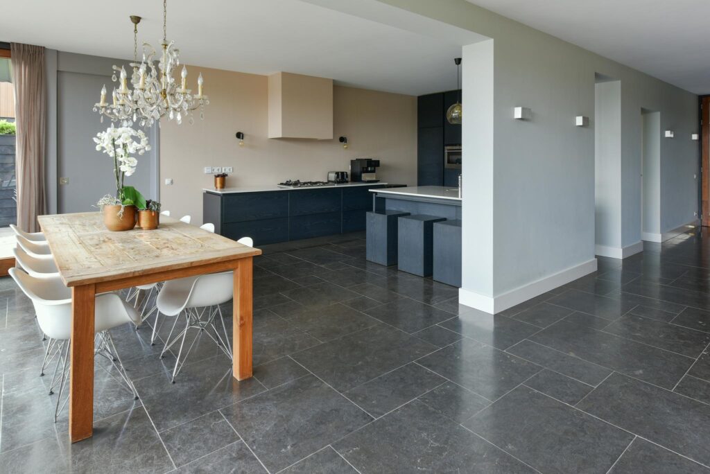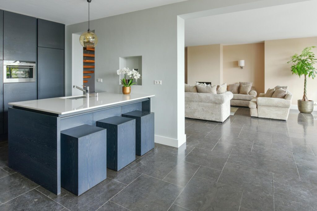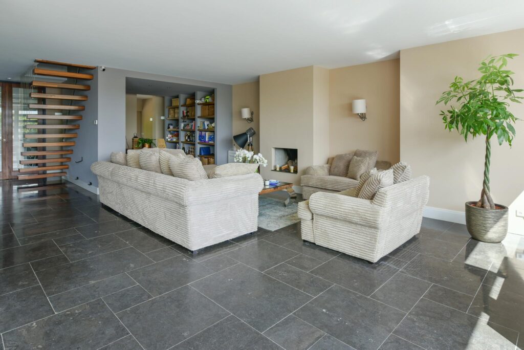 Bij het betreden van de villa word je verwelkomd door een prachtige entree, hal naar het hangende toilet met fonteintje en daarachter een stijlvolle trap naar de verdieping. De sfeer van luxe en elegantie is direct voelbaar en zet de toon voor wat je verder binnen kunt verwachten.
