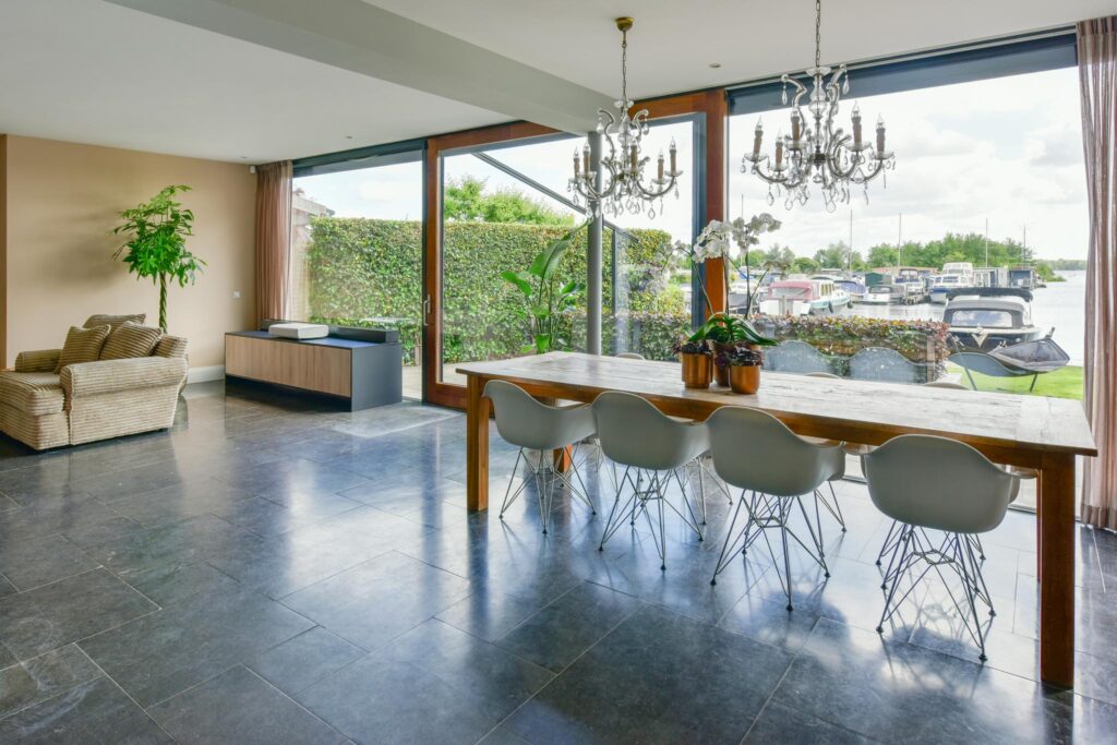 De natuurlijke afwerkingsmaterialen zorgen voor een warme, uitnodigende sfeer, terwijl de grote raampartijen panoramische uitzichten bieden op het water.