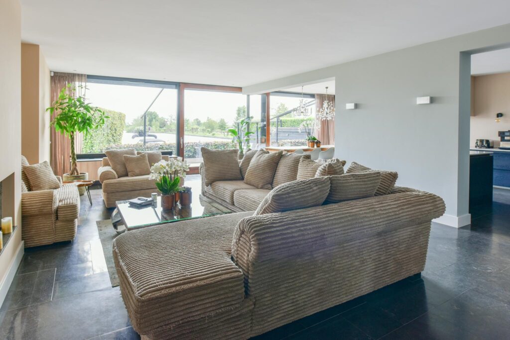 Binnen is de woning een waar voorbeeld van luxe, met hoogwaardige afwerkingen en moderne voorzieningen die geen compromis maken op comfort. Van een riante living tot een luxe keuken, alles in deze woning straalt verfijning uit. Het gebruik van duurzame materialen en energiezuinige technologieën zorgt ervoor dat de woning niet alleen stijlvol is, maar ook milieuvriendelijk.
