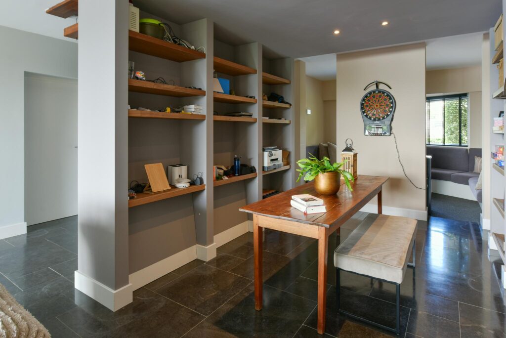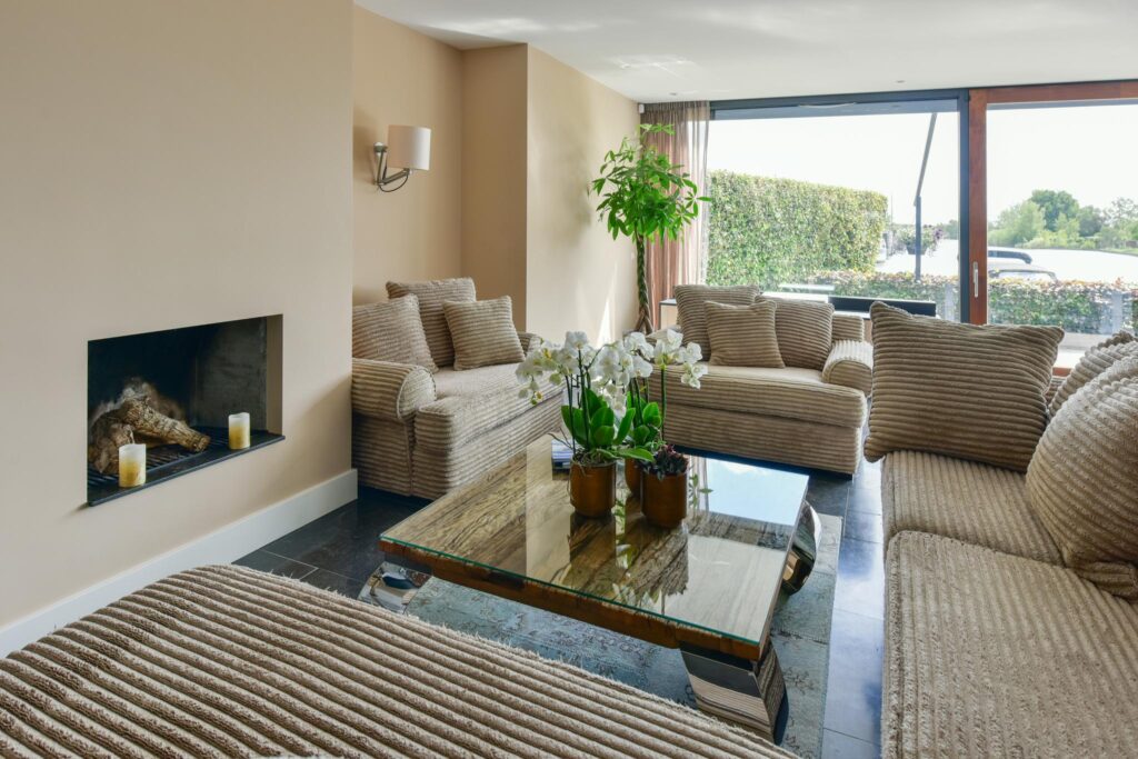 De woonkamer beschikt verder over een bibliotheek en een open haard.