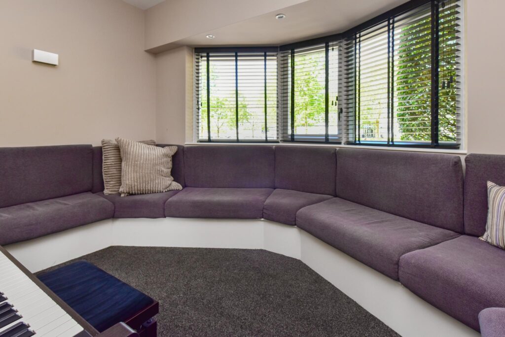 Aan de voorzijde is een knusse hoek met ronde bank en plaats voor een televisie.