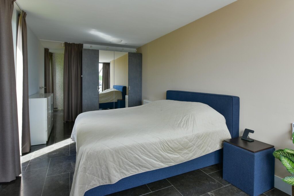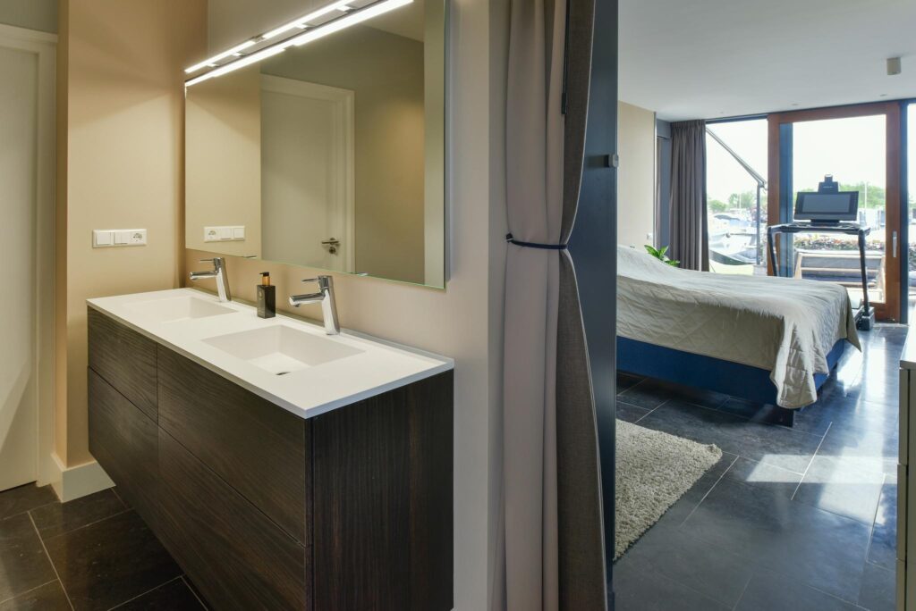 Royale masterbedroom, met eveneens een groot raampartij en een prachtig uitzicht over het water, beschikt over een kastenwand en een badkamer en suite. De badkamer is voorzien van een inloopdouche, toilet en een dubbel wastafelmeubel.