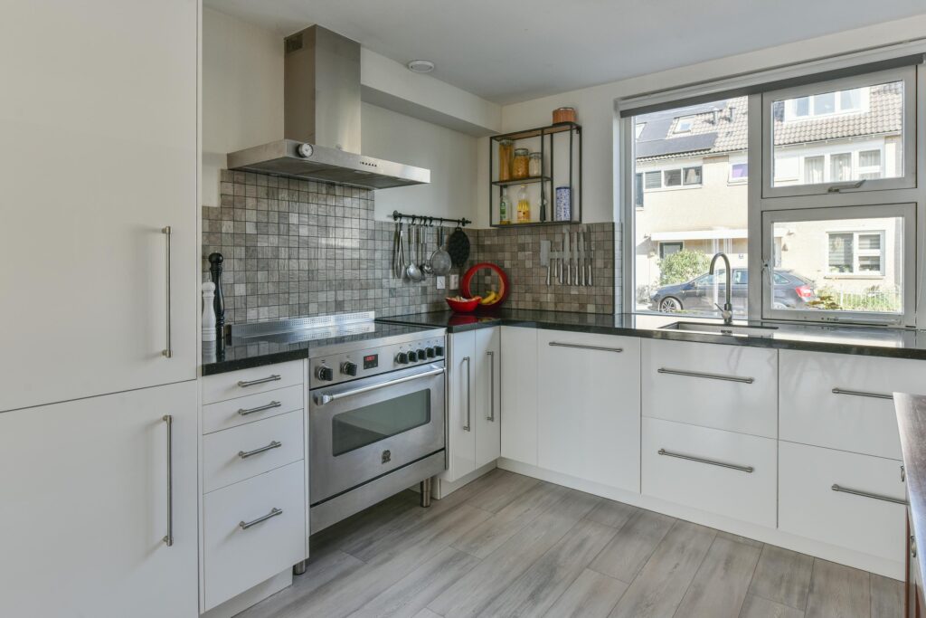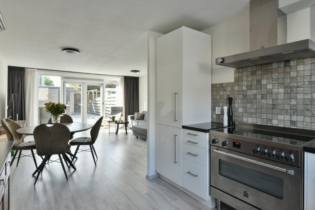 De open keuken is gelegen aan de voorzijde en is voorzien van een vrijstaand gasfornuis met inductiekookplaat en brede oven, vaatwasser en een koel-/vriescombinatie.