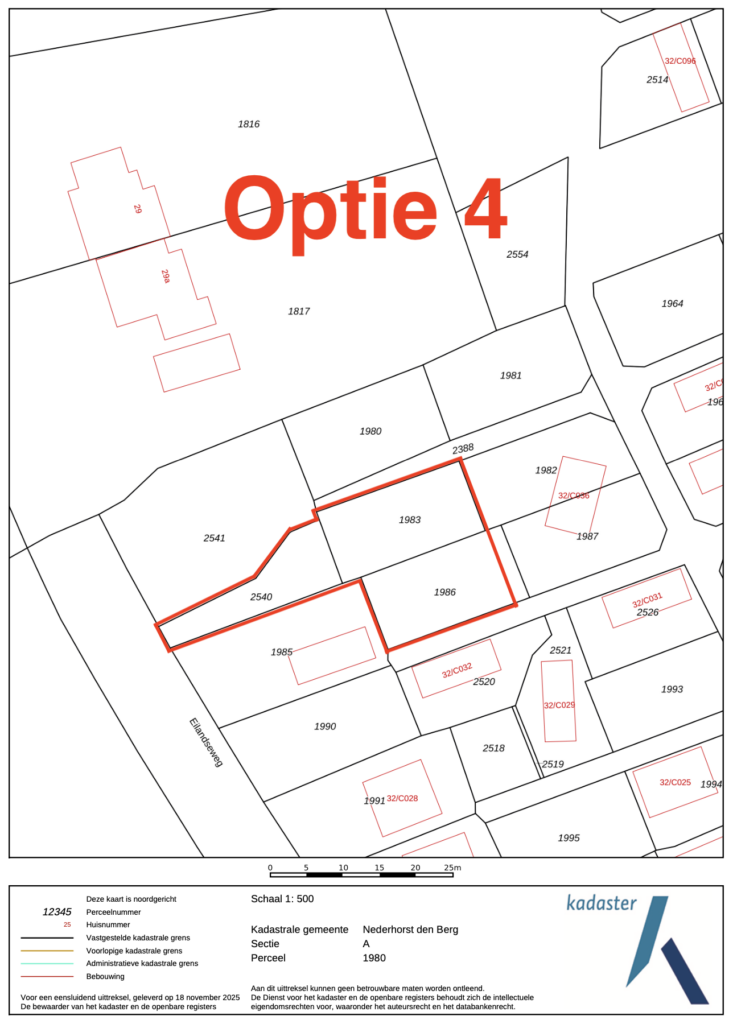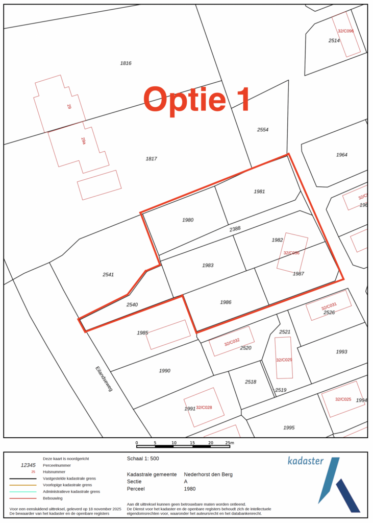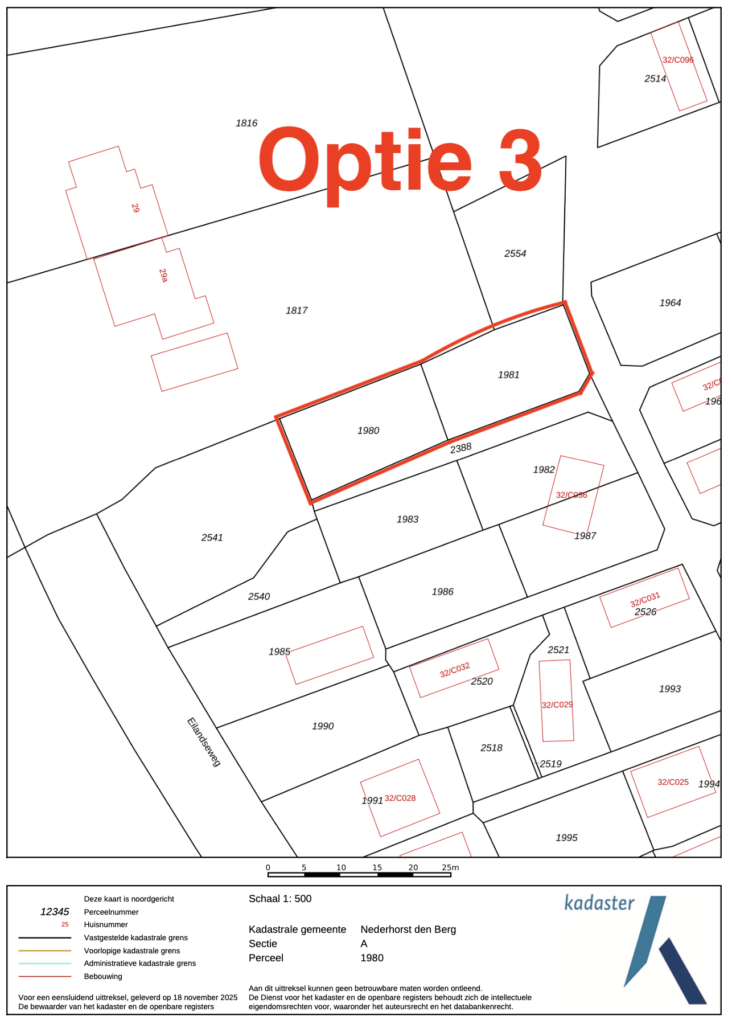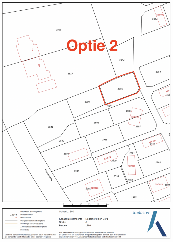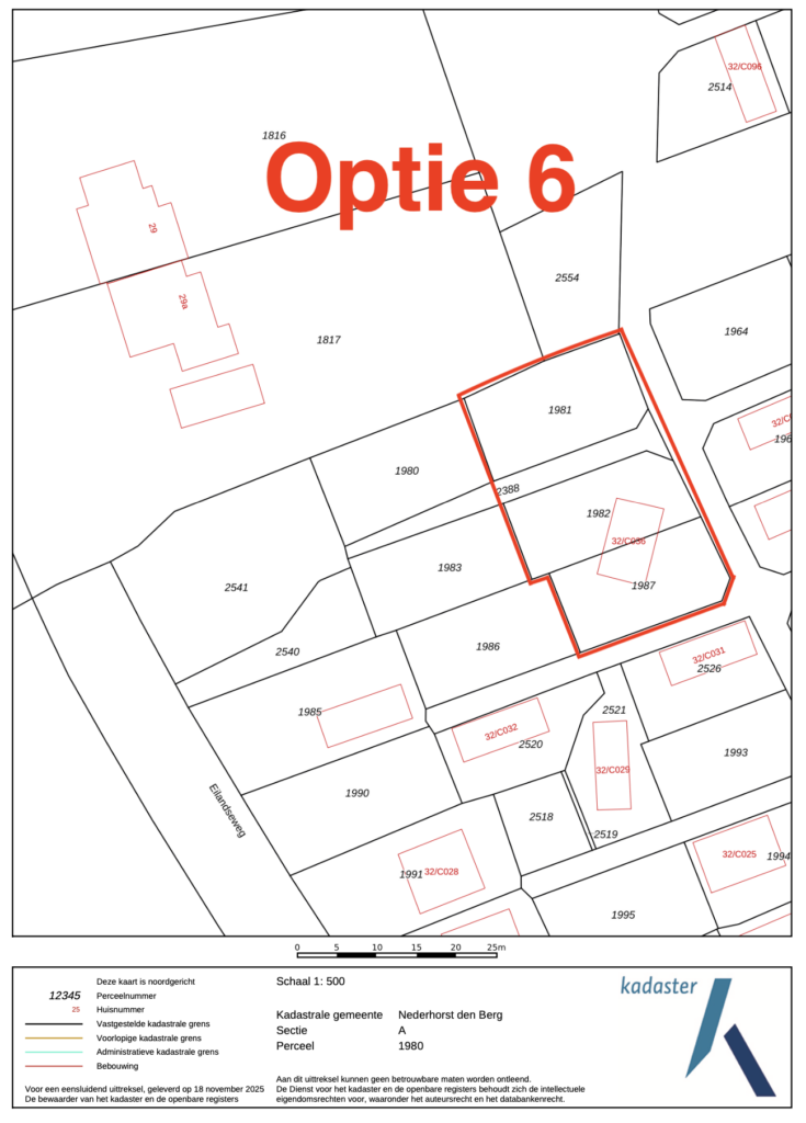 Drie kavels alsmede een gedeelte van de “weg” met een totale oppervlakte van circa 766 m2 (nummers 1981, 1982, 1987 en 2388 gedeeltelijk). Thans bestaande uit een royaal luxe chalet van circa 60 m2, schuur, buitenkeuken en eigen oprit met elektrisch bedienbare poort met gelegenheid voor het parkeren van drie auto’s.