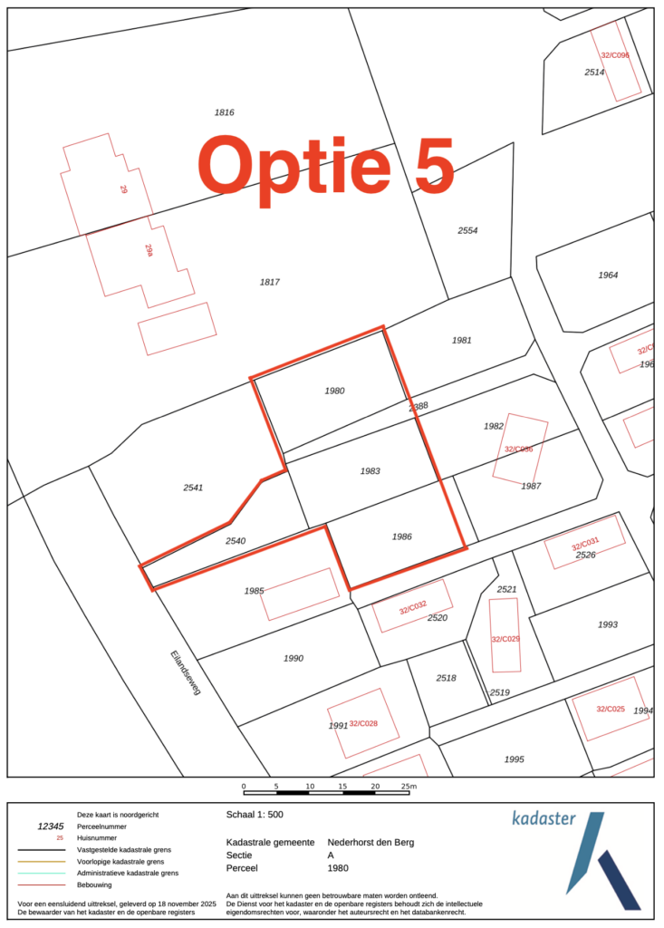 Vier kavels alsmede een gedeelte van de “weg” met een totale oppervlakte van circa 833 m2 (nummers 2540, 1983, 1986, 1980 en 2388 gedeeltelijk). Thans bestaande uit overkapping, natuurzwemvijver, twee schuren, tuin en gedeeltelijke toegangsweg. Mogelijkheid tot het plaatsen van een chalet van maximaal 55 m2.