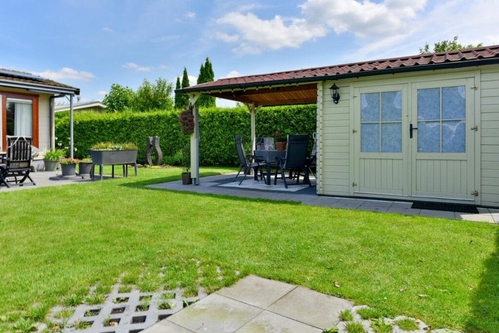 Vrijstaande houten schuur met elektra.