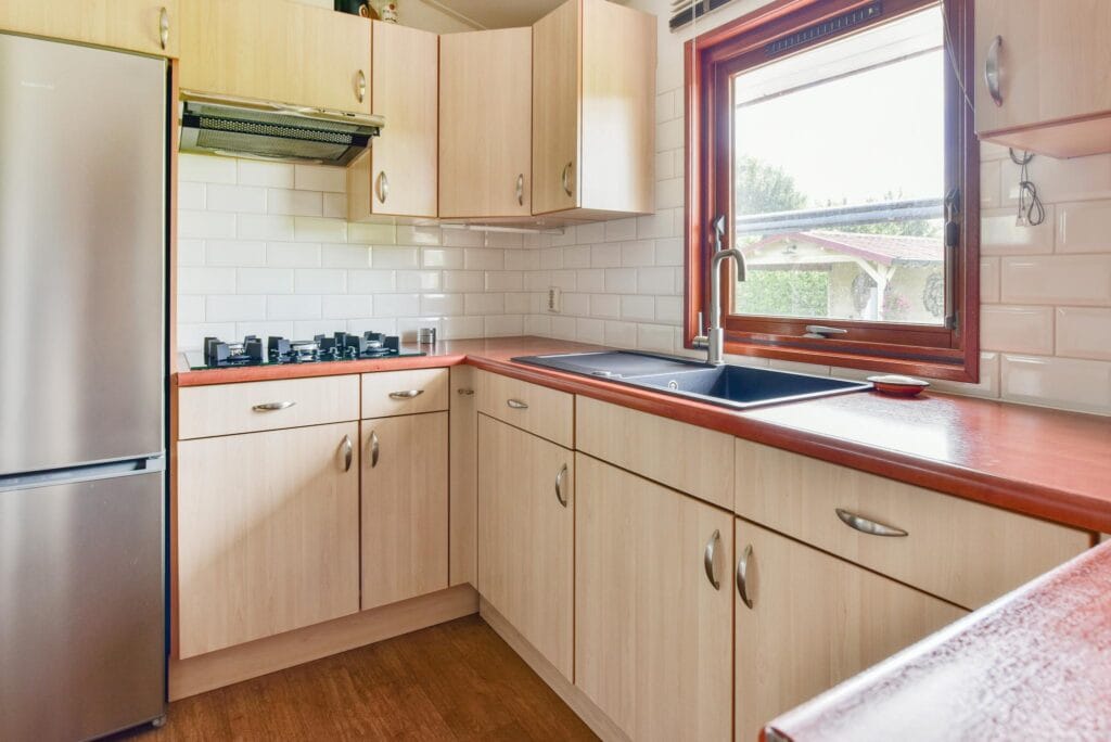De open keuken grenst aan de woonkamer en is voorzien van 5-pitsgaskookplaat, diepe spoelbak en koel-/vriescombinatie.