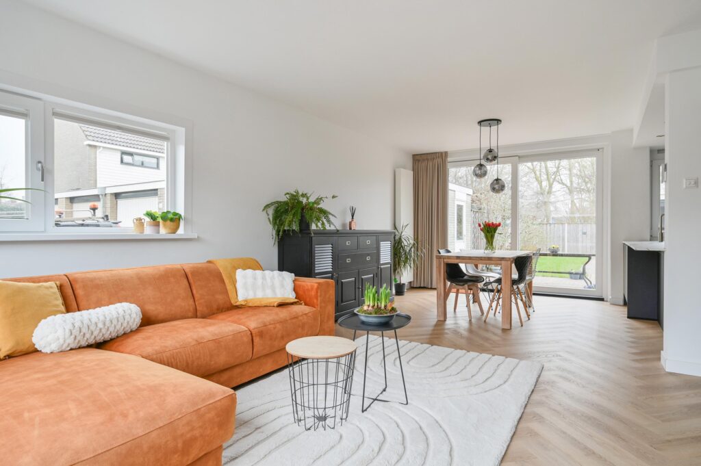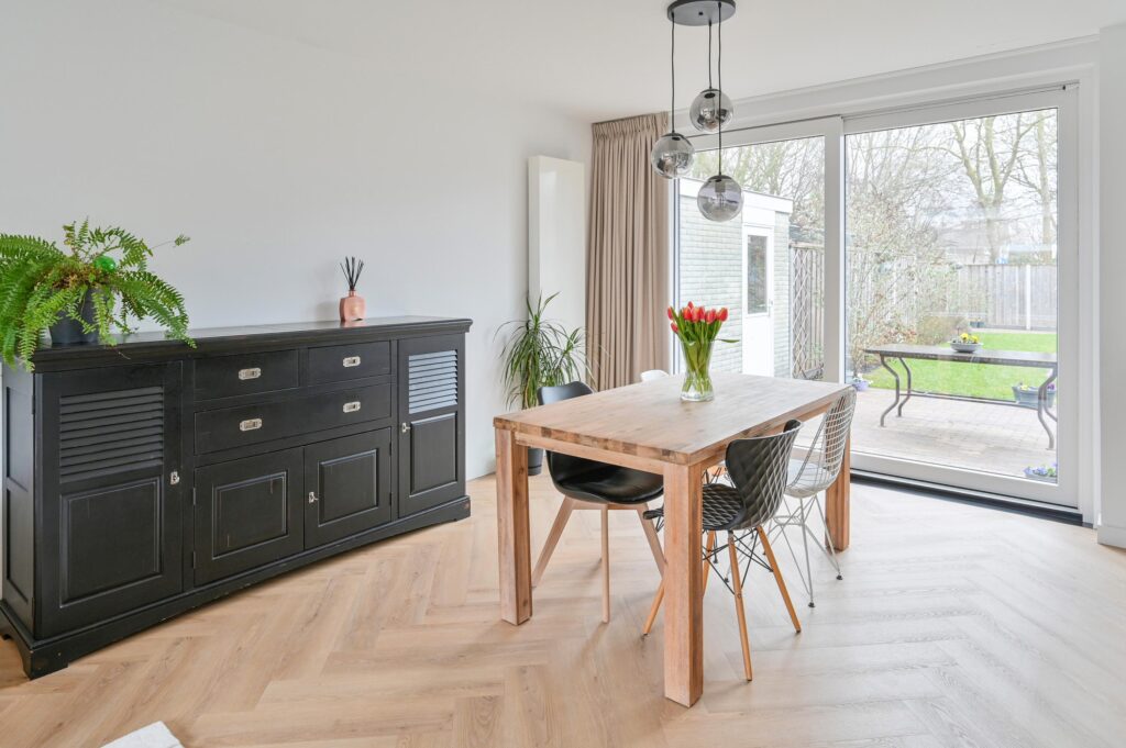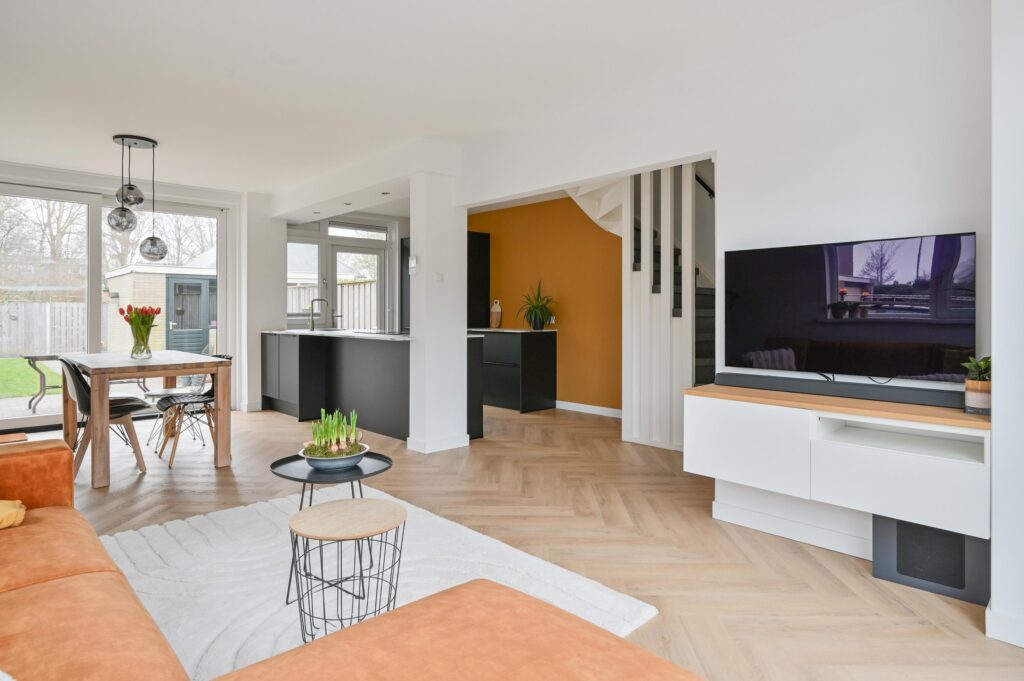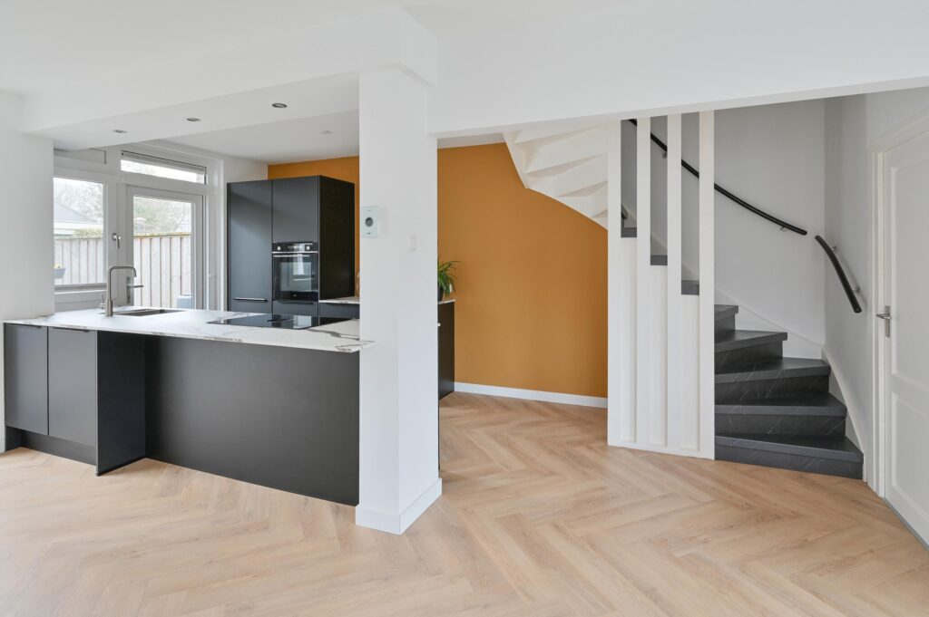 Ruime woonkamer met schuifpui, PVC-vloer in visgraatmotief en vloerverwarming. Mooie open keuken aan de achterzijde voorzien van inductiekookplaat met geïntegreerd afzuigsysteem (BORA), vaatwasser, close-in boiler, combi-oven, koel-/vriescombinatie en een deur naar de achtertuin.