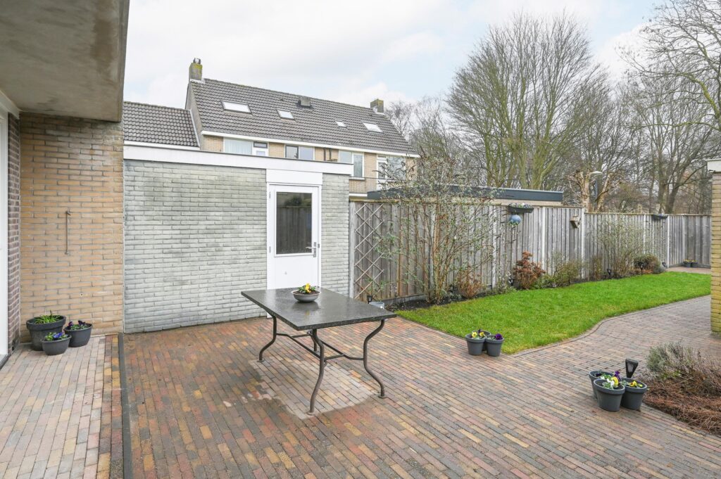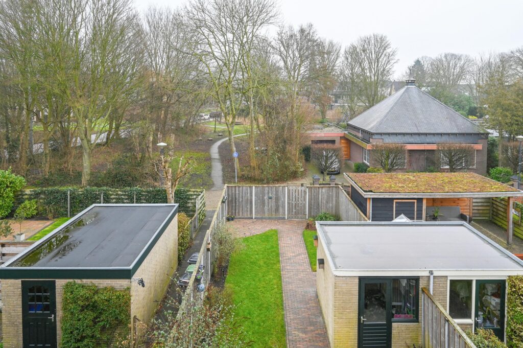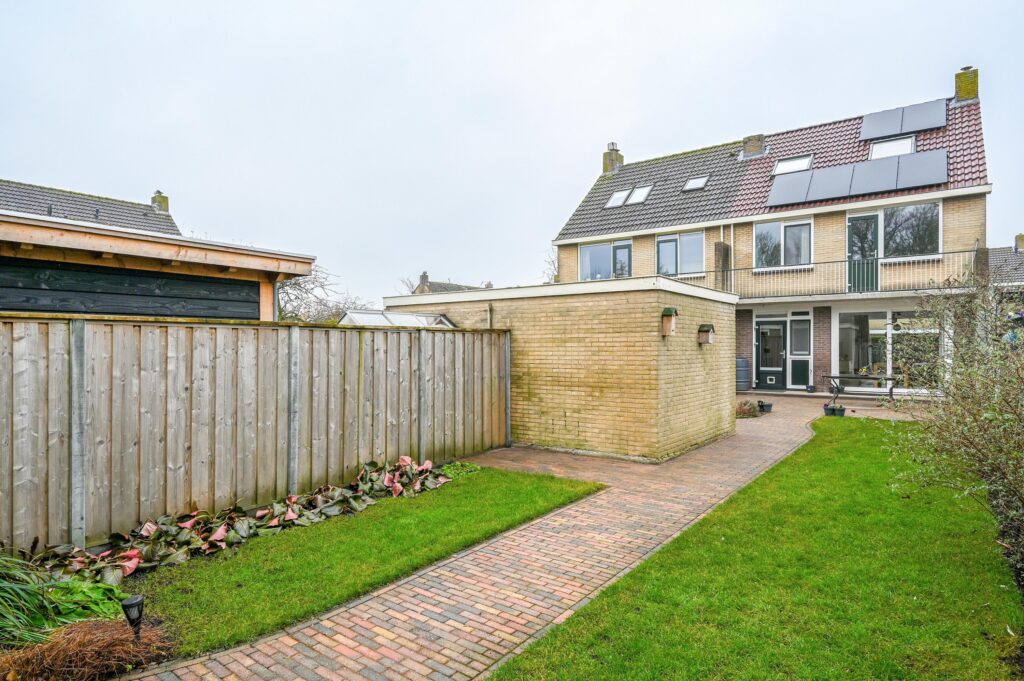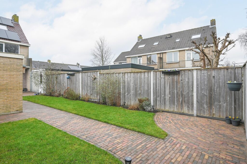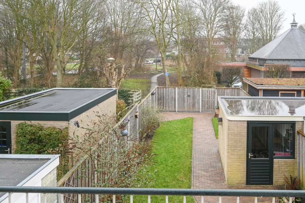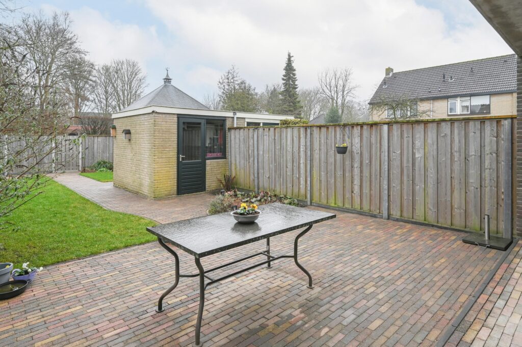 Ruime en verzorgde achtertuin, 19 meter (!), met stenen schuur en achterom is gelegen op het oosten. De achtertuin heeft meerdere terrasjes waar (bijna) de gehele dag van de zon genoten kan worden. Vanuit de tuin is eveneens de garage te bereiken via een loopdeur. Op het eigen terrein voor de garage is gelegenheid om zeker twee auto's te parkeren.