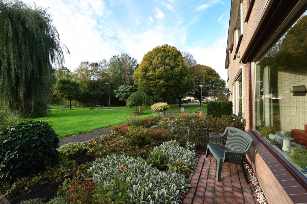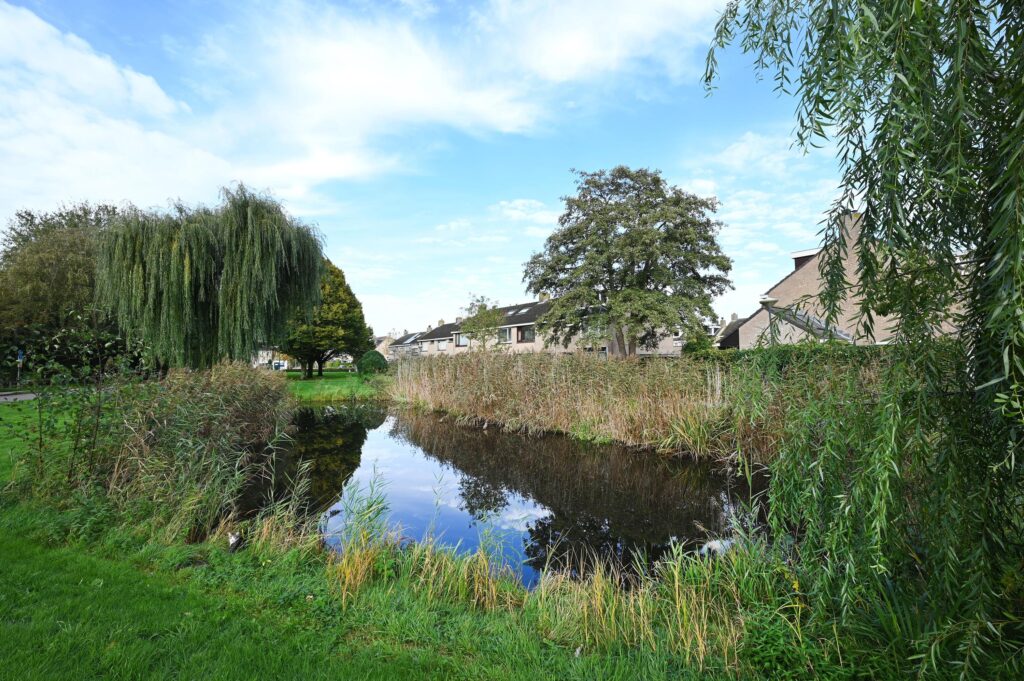Verzorgde voortuin en een prachtig, vrij uitzicht op het plantsoen met waterpartij.