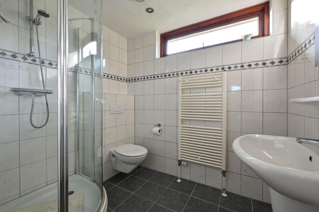 Overloop met toegang tot drie slaapkamers variërend in grootte. Badkamer met wastafel, douche en toilet.