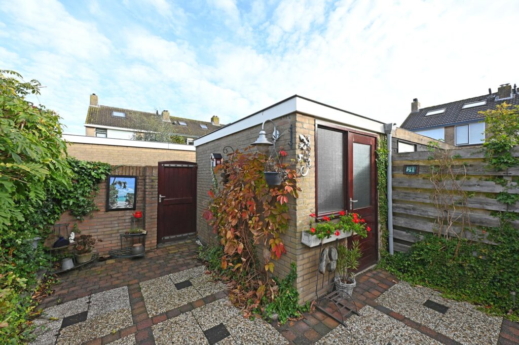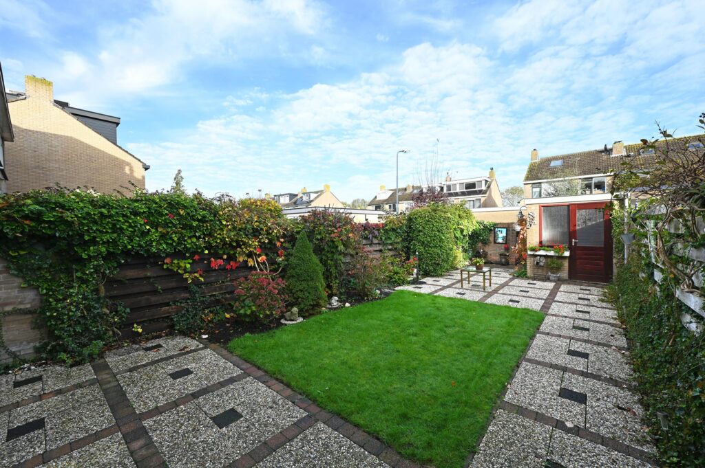 Aangename diepe achtertuin gelegen op het noorden met schuur en een achterom.