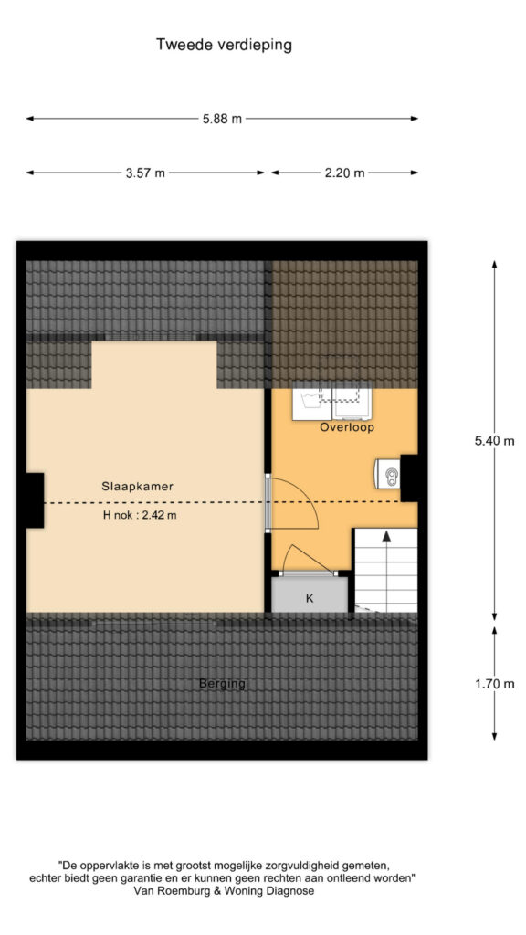 De tweede verdieping is praktisch ingericht; er is een slaapkamer met dakkapel aan de achterzijde. Op de voorzolder is de opstelling voor de wasmachine/droger alsmede de c.v.-installatie. Deze verdieping biedt tal van optimalisatie mogelijkheden.