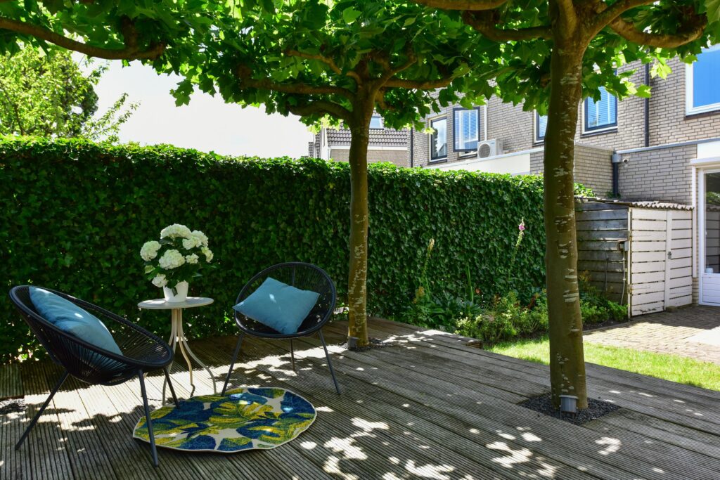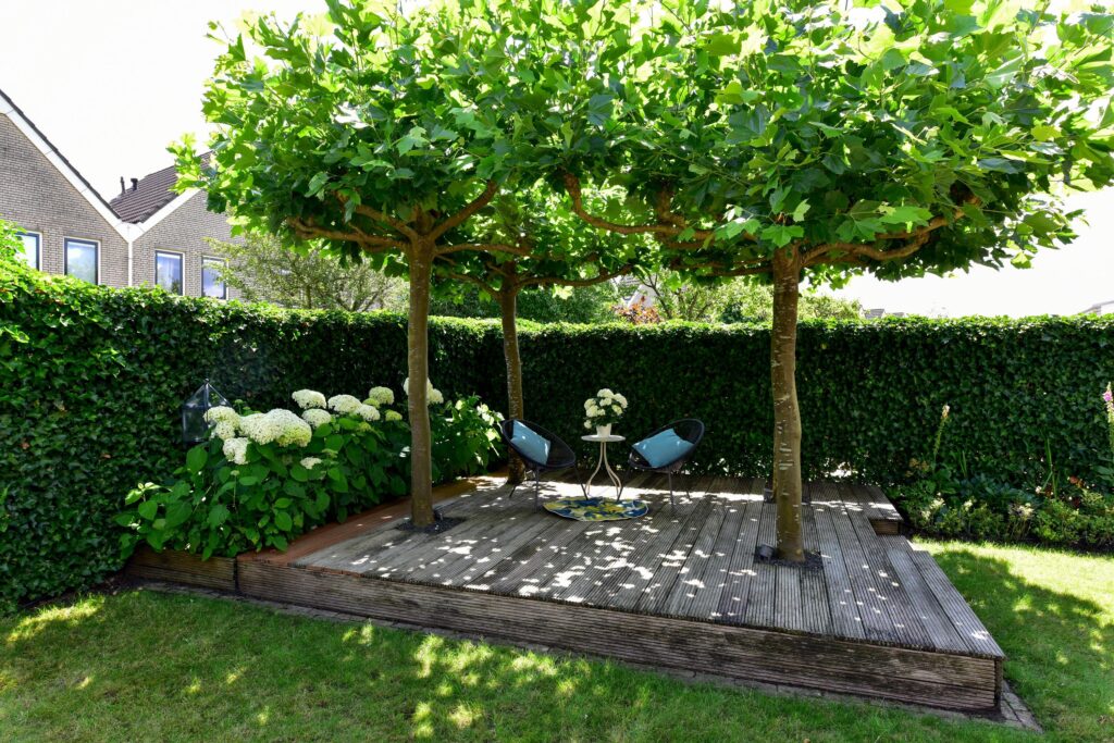 Deur naar achtertuin. De ruime achtertuin is gelegen op het oosten, meerdere terrasjes waar volop van de zon genoten kan worden of juist van een lekker plekje in de schaduw onder de Platanen.