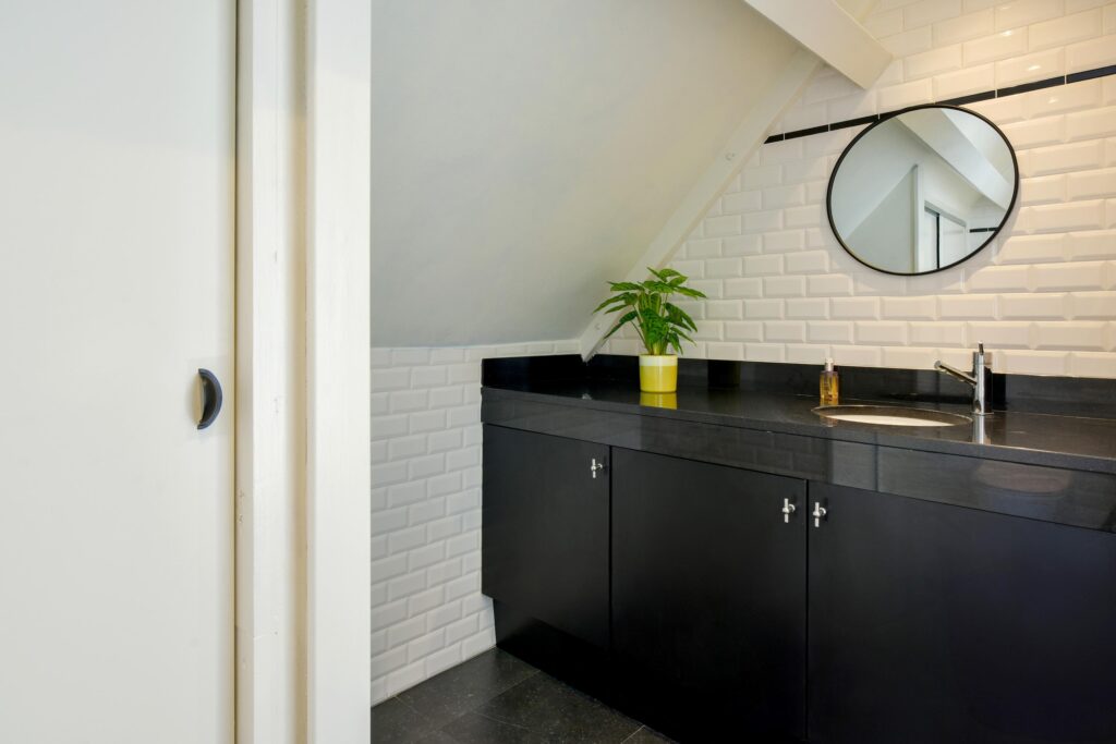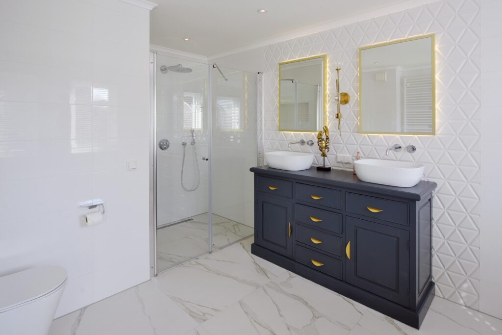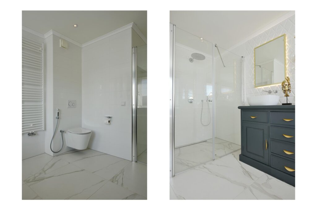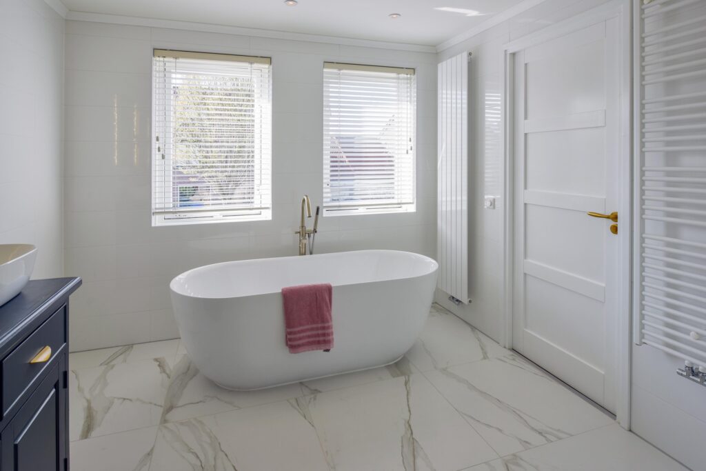 - Luxe badkamer met dubbele wastafel, inloopdouche, vrijstaand ligbad en toilet;