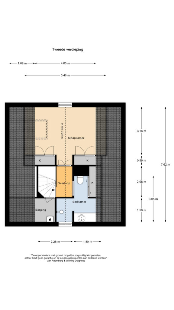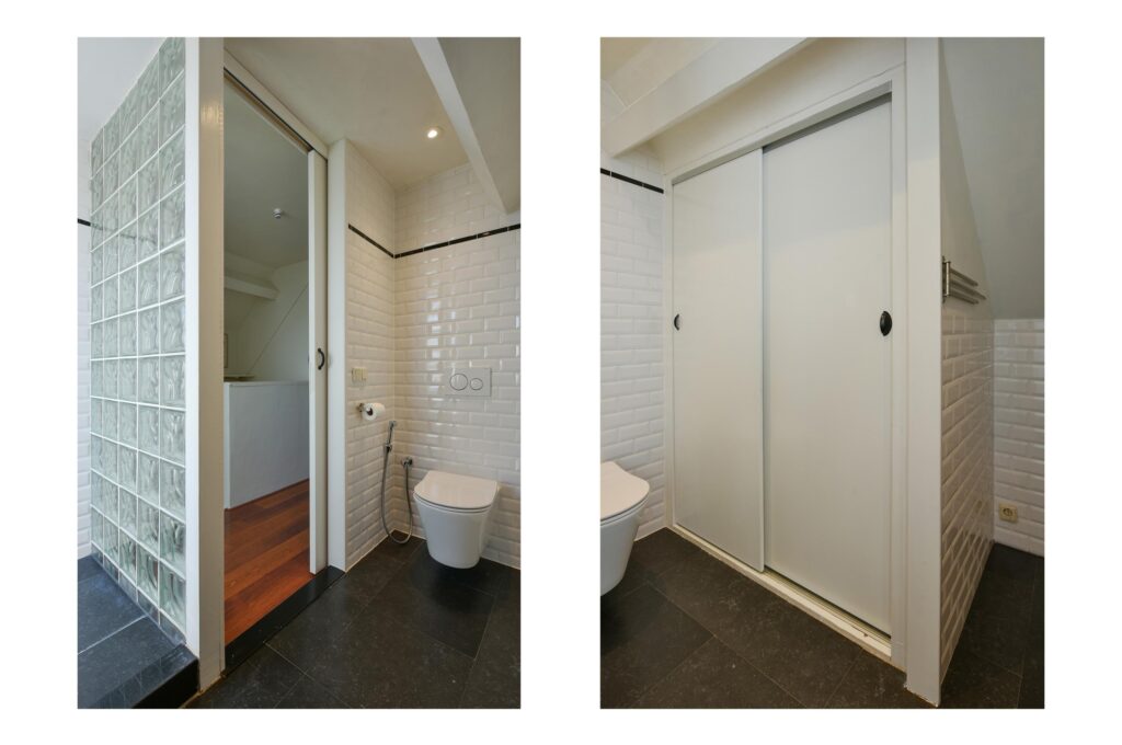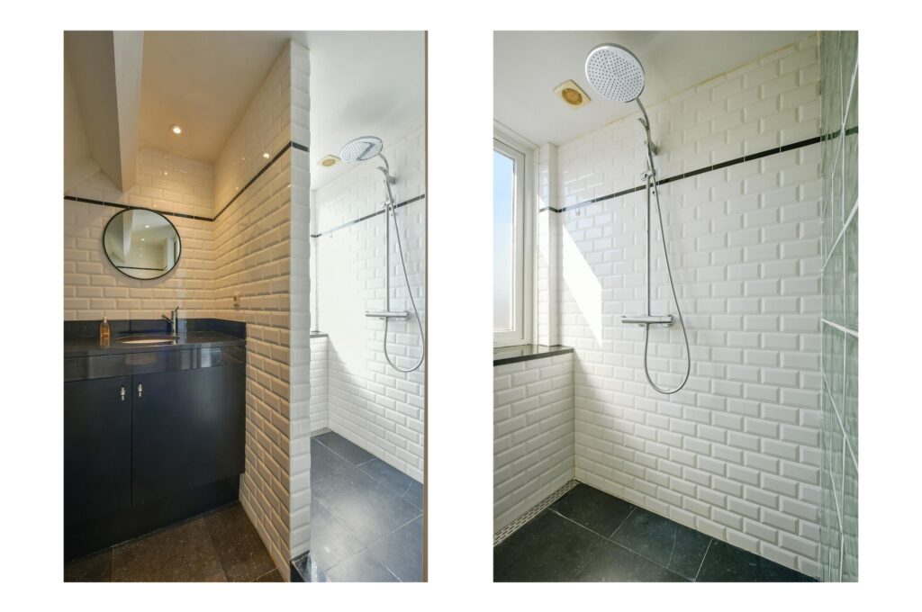 berging met opstelling c.v.-installatie en een tweede badkamer. Deze badkamer beschikt over een wastafel, inloopdouche en een toilet. Vierde slaapkamer aan de achterzijde, met inbouwkasten, dakraam en zeer fraai uitzicht.