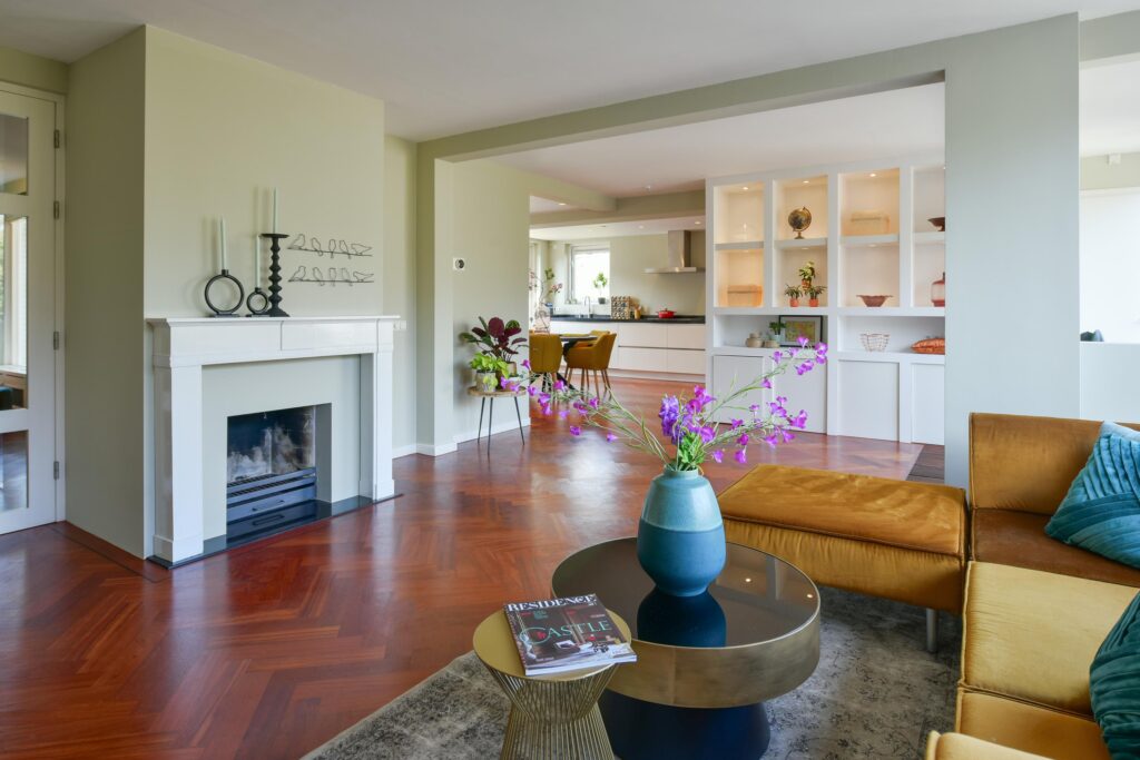 Toegang tot de woning, ruime hal en garderobekasten. Tweede hal, welke goed ingericht kan worden als werkplek, bibliotheek of speelruimte voor de kinderen, meterkast en de trapopgang. Zeer ruime en lichte woonkamer met open haard en visgraatparketvloer.