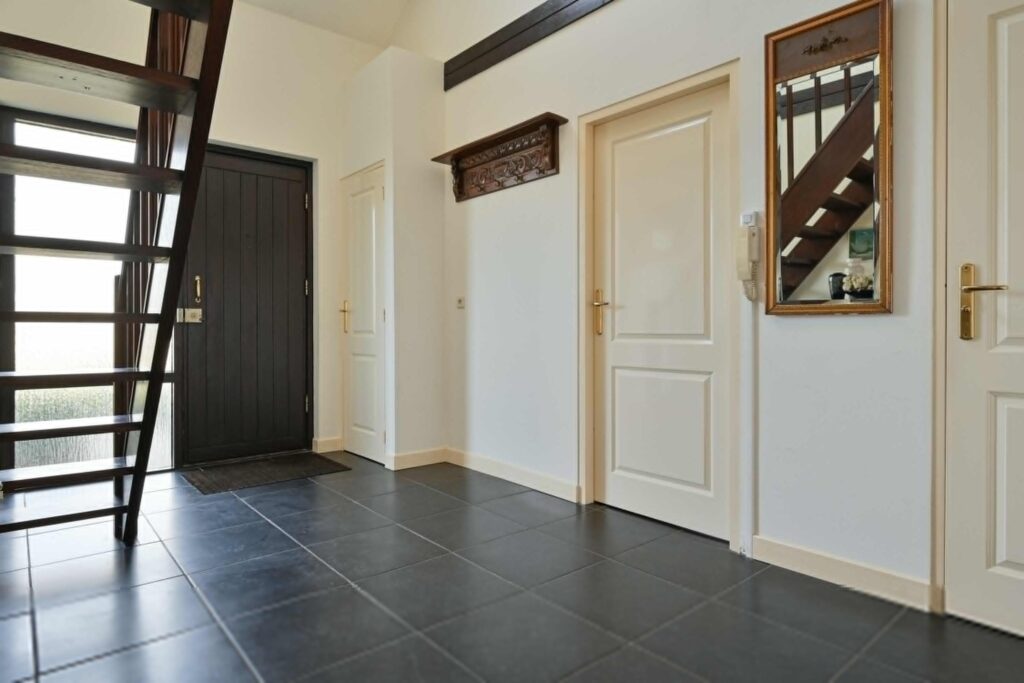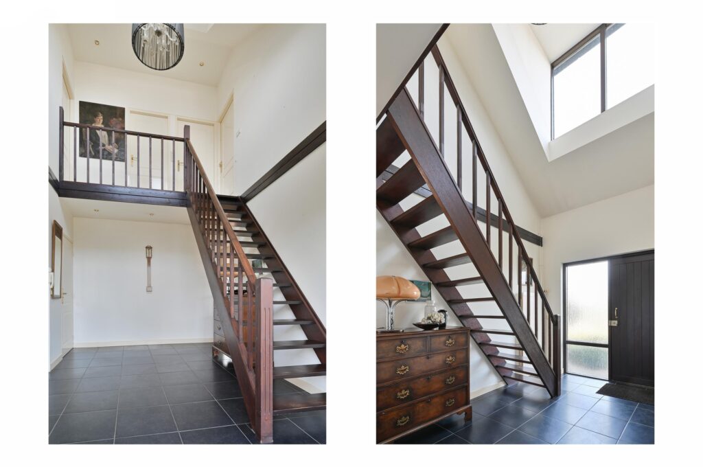 Royale hal met vide, toilet, meterkast, toegang tot de woonkamer, kantoor/slaapkamer en trapopgang naar de eerste verdieping.