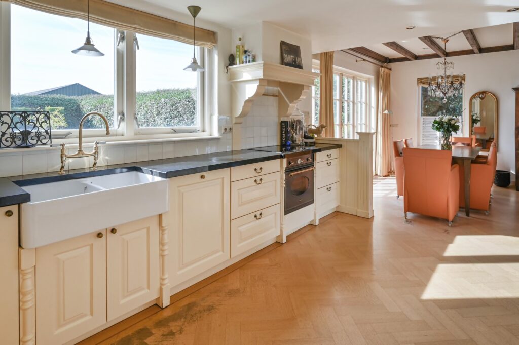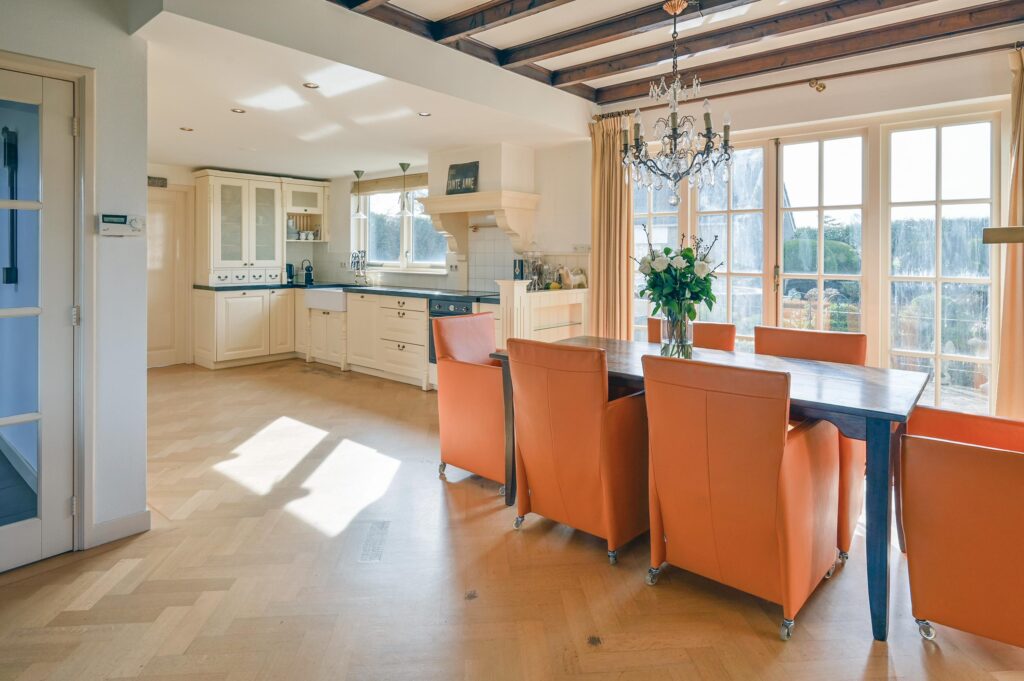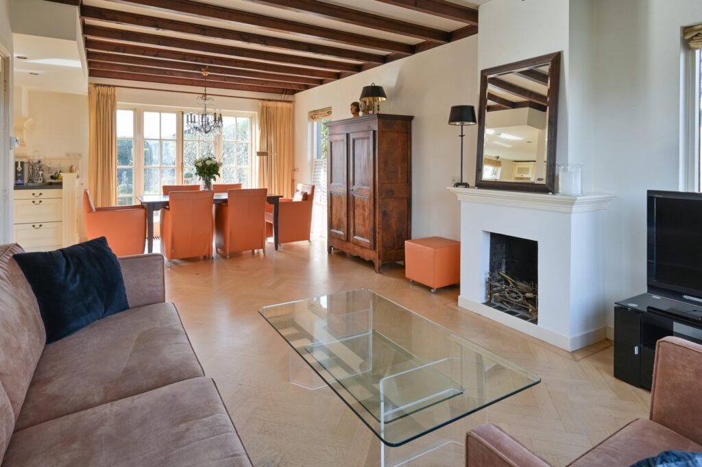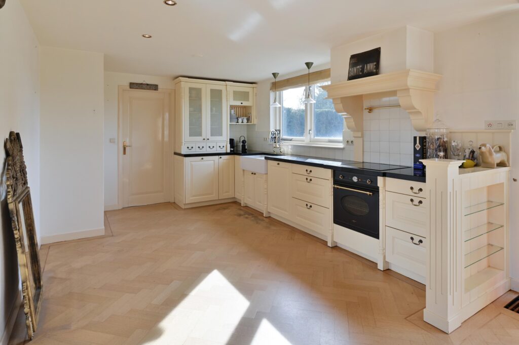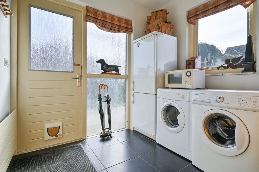 Ruime en lichte L-vormige woonkamer met open keuken aan de achterzijde. De bijkeuken beschikt over aansluitingen voor de wasmachine en droger. De aangename woonkamer heeft veel daglichttoetreding door de ramen rondom.