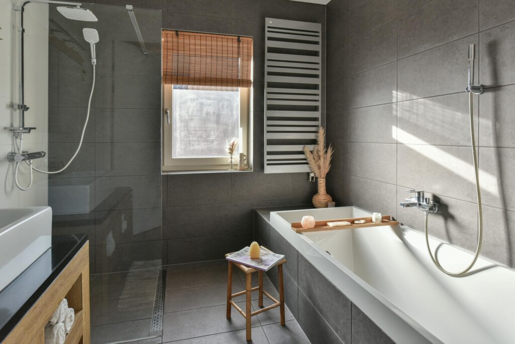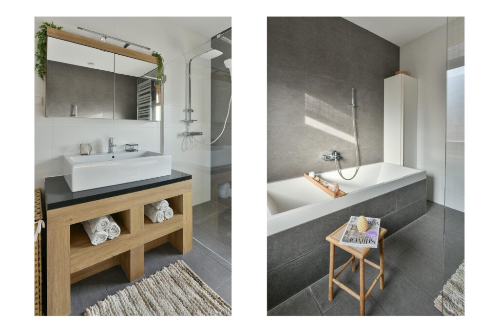 - Badkamer met wastafel, inloopdouche en ligbad;