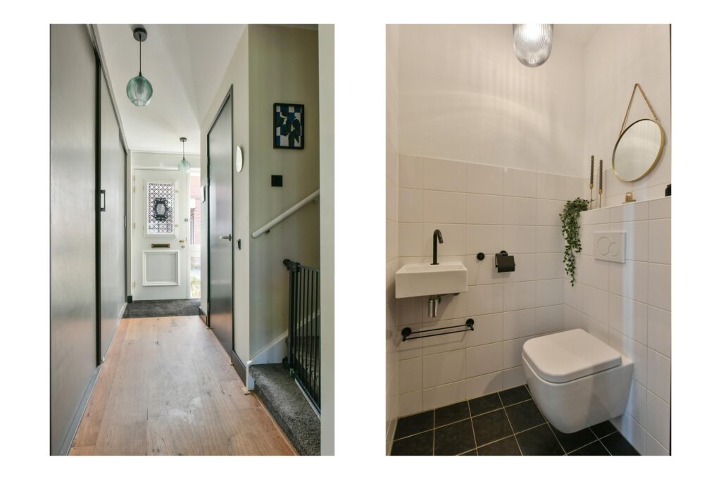 Via de voortuin is de entree van de woning te bereiken. Toegang tot de woning, gang met meterkast, toilet, ruime kast en trap naar de eerste verdieping.
