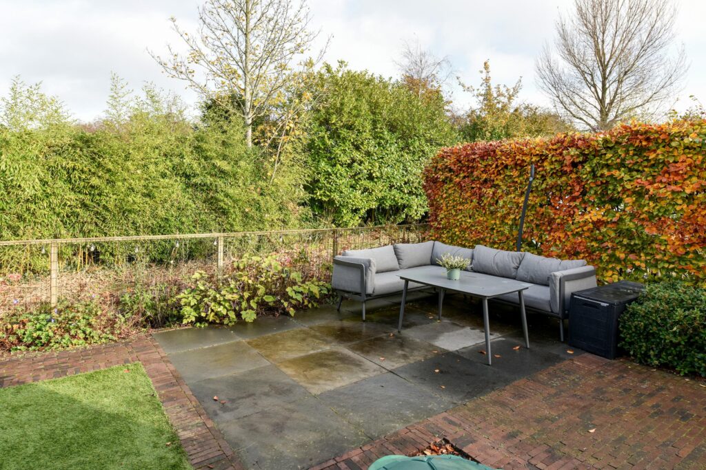 Fraaie verzorgde tuin met meerdere terrassen om op ieder moment van de dag een zonnestraal mee te kunnen pikken.