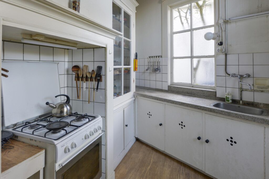 Tussenkamer met bedstee en toegang naar de kelder. Dichte keuken met schouw en gasfornuis.