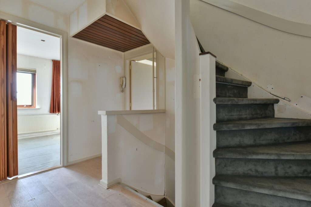 Toegang tot de woning, ruime hal met toilet, trapopgang naar eerste verdieping, trapkast, toegang naar de garage, keuken en woonkamer.